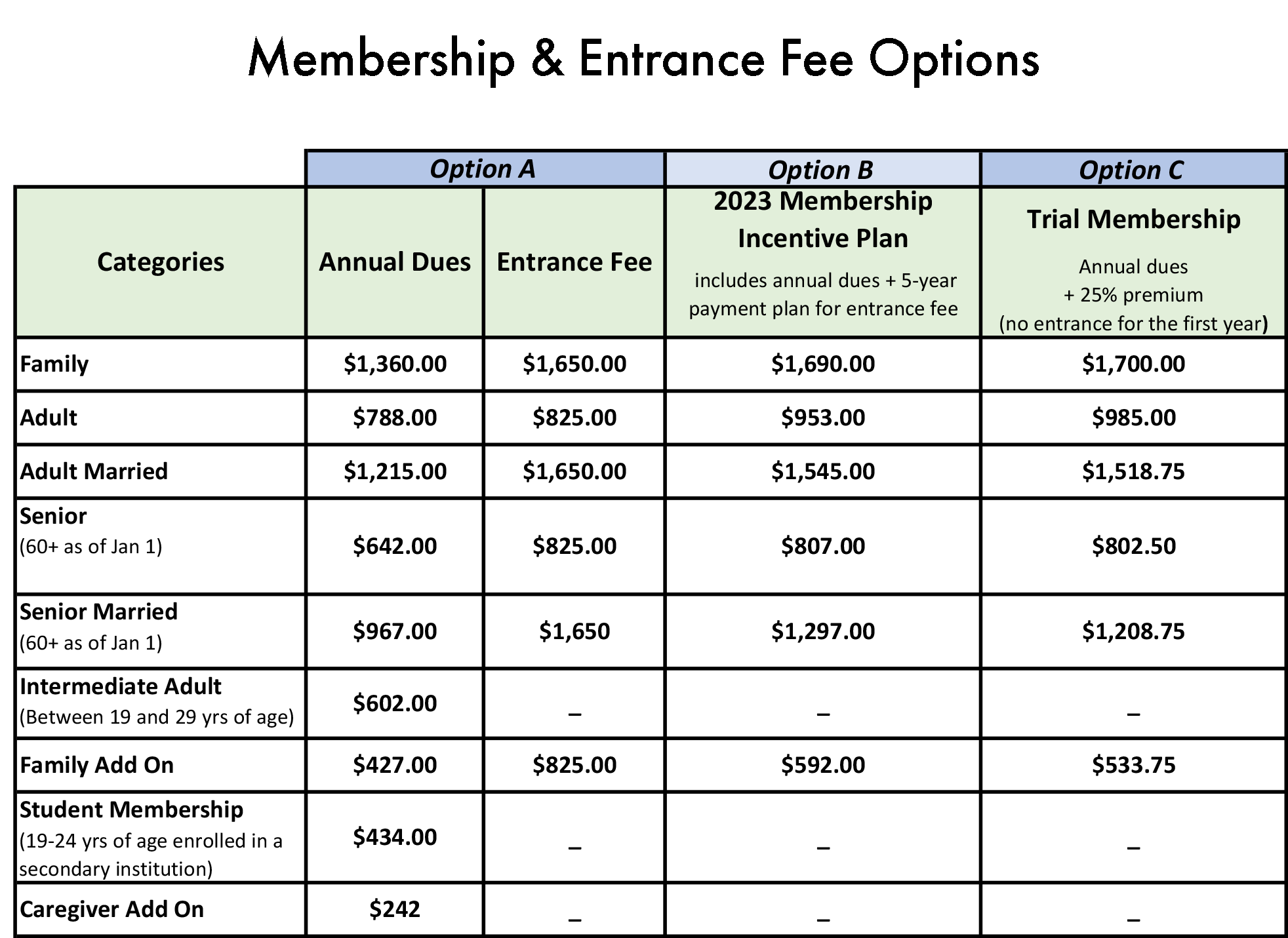 Once a spot for full membership becomes available, the administration will contact you for next steps and to decide on an Entrance Fee option.