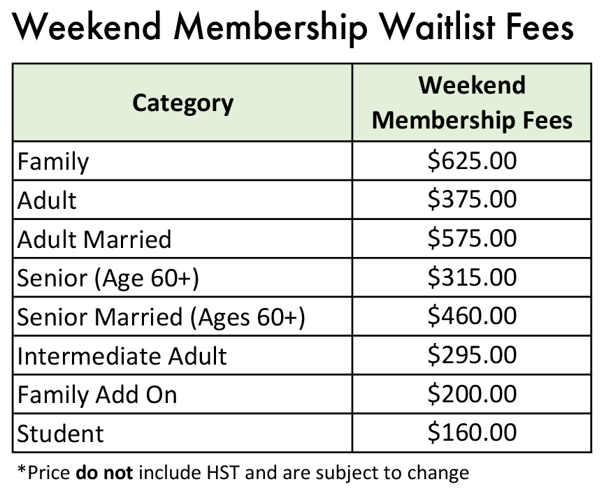 Once off the Tier 1 Waitlist, and the weekend membership fee has been received, you will be considered a Weekend Waitlist Member. This Weekend Membership allows access to the club Friday after 6PM, Saturdays, Sundays and holiday Mondays. If a membership position opens in the same calendar year, the waitlist fee will be applied to the cost of the membership. Weekend Memberships are also eligible to register for weekend programming.