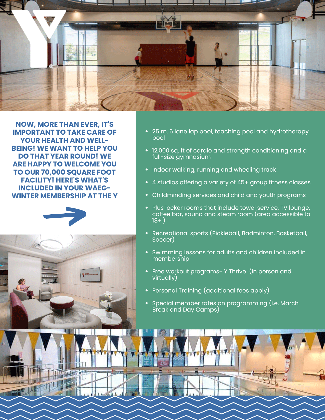 As an added bonus: All Waeg winter YMCA memberships will include access to their Plus locker rooms, which has a towel service, a TV lounge, coffee bar, sauna and steam room (area accessible to 18+ only)